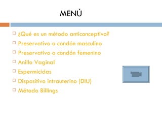 Este documento describe diferentes métodos anticonceptivos, incluyendo preservativos masculinos y femeninos, anillos vaginales, espermicidas, dispositivos intrauterinos, y el método Billings. Explica brevemente cómo funciona cada método para prevenir el embarazo impidiendo la fertilización o implantación.