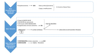 Este documento describe los pasos y departamentos involucrados en el proceso de revisión y aprobación de planos de parcelación. Incluye verificar los datos catastrales y jurídicos en el sistema GEO, revisar posibles deudas fiscales, actualizar la información de parcelas y empadronamiento, y cargar valores y mejoras antes de aprobar el plano de forma definitiva.
