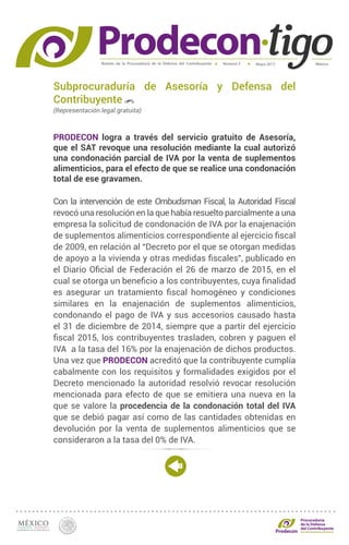 El boletín resume varios casos en los que la Procuraduría de la Defensa del Contribuyente (PRODECON) logró ayudar a contribuyentes mediante sus servicios gratuitos de asesoría y representación legal. En algunos casos, PRODECON logró que la autoridad fiscal devolviera pagos indebidos, reconociera la prescripción de créditos fiscales, disminuyera obligaciones fiscales de manera retroactiva, y reconociera saldos a favor de impuestos que habían sido negados.