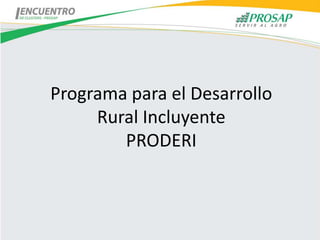 El Programa para el Desarrollo Rural Incluyente (PRODERI) tiene como objetivo incrementar la calidad de vida y los ingresos de 254 mil productores y pobladores rurales pobres en toda Argentina, priorizando la región NOA. PRODERI implementará planes de negocio a través de alianzas con organizaciones locales y proveerá fondos no reembolsables y capital de trabajo para mejoras productivas, acceso a mercados, apoyo a comunidades indígenas, y oportunidades para jóvenes, mujeres y trabajadores rurales.