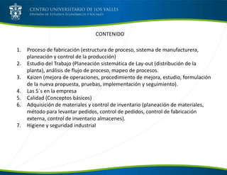 Este documento presenta el contenido del Módulo III de Administración de Operaciones. Cubre temas como procesos de fabricación, estudio del trabajo, mejora continua (Kaizen), organización y limpieza (Las 5S), calidad, adquisición de materiales e inventario, e higiene y seguridad industrial.