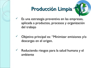 La producción limpia es una estrategia preventiva aplicada a productos, procesos y organización del trabajo en las empresas. Su objetivo principal es minimizar emisiones y descargas en el origen para reducir riesgos a la salud humana y el ambiente. Entre sus beneficios se incluyen la eficiencia, competitividad, acceso a mercados, menores costos y riesgos. Las acciones clave son minimizar el uso de insumos, agua, energía y materiales tóxicos y maximizar el reciclaje para reducir el impacto ambiental en todo el