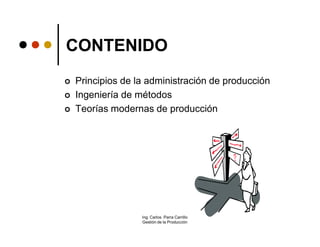 Este documento presenta un módulo sobre administración de la producción impartido por Carlos Parra Carrillo. El contenido incluye principios de administración de producción, ingeniería de métodos, teorías modernas de producción y sistemas de producción flexibles. El documento también contiene preguntas sobre conceptos relacionados con la gestión de la producción y la competitividad de las empresas.