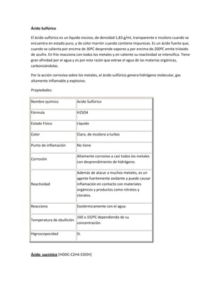El documento proporciona definiciones y descripciones breves de varios compuestos químicos orgánicos e inorgánicos. Explica que el opérculo es un órgano que sirve para cerrar aberturas en peces y otros seres vivos. Describe las propiedades y usos del ácido fumárico, ácido sulfúrico, ácido succínico y gas carbónico. También proporciona información sobre el hidróxido de magnesio, incluidos sus usos como antiácido y laxante.