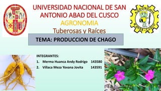 El documento describe el cultivo del chago (Mirabilis expansa), un tubérculo nativo de los Andes con alto valor nutricional. Se detalla su siembra entre septiembre y enero usando hijuelos, esquejes o semillas, así como su cosecha manual entre 7-10 meses. El chago tiene alto contenido proteico y mineral, y se consume cocido, frito o deshidratado en Perú, Ecuador y Bolivia. Rendimientos típicos son de 45,000-137,000 kg/ha.