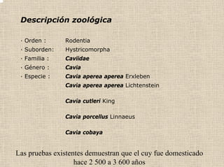 El documento describe la producción de cuyes en el Perú, incluyendo su descripción zoológica, importancia económica, tipos, sistemas de cría, alimentación, reproducción y enfermedades. El cuy es una especie nativa de los Andes criada principalmente para su carne de alto valor nutritivo. El Perú y Ecuador tienen la mayor población mundial de cuyes, siendo una importante fuente de seguridad alimentaria y empleo en zonas rurales.