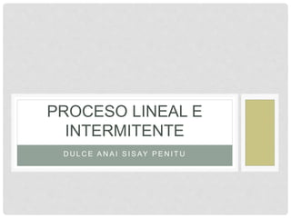 El documento describe dos procesos de producción: lineal y intermitente. El proceso lineal se caracteriza por producir un solo producto de forma repetitiva y continua logrando altos niveles de eficiencia. El proceso intermitente produce por lotes de forma irregular en diferentes departamentos, lo que resulta en una carga de trabajo variable entre ellos.