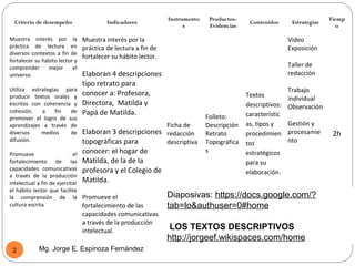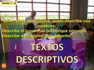Este documento contiene tres descripciones. La primera describe a un gallo de manera detallada, enfocándose en sus características físicas. La segunda describe una pieza de cerámica peruana, mencionando sus dimensiones, diseño y características. La tercera es una descripción topográfica de una plaza, incluyendo detalles sobre los edificios, personas y evento que se lleva a cabo.