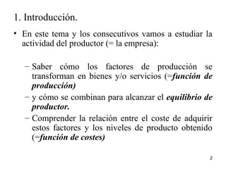 Este documento resume los conceptos clave de la producción y costes a corto y largo plazo. En el corto plazo, la producción depende del factor variable trabajado y muestra rendimientos decrecientes. En el largo plazo, la producción depende de capital y trabajo, y puede mostrar rendimientos constantes, crecientes o decrecientes. Las funciones de costes total, variable y marginal describen la relación entre producción y costes a corto plazo. En el largo plazo, las isocuantas y la recta isocoste representan