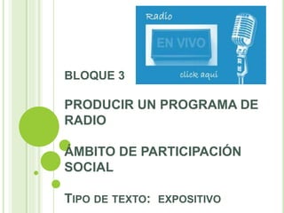Este documento proporciona información sobre la producción de un programa de radio, incluyendo los pasos a seguir como establecer el tipo de programa, aspectos generales y particulares, planificar los tiempos, y realizar guiones. También discute la importancia de los programas de radio como medio de difusión y las funciones que pueden cumplir.