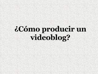 Este documento proporciona instrucciones para producir un videoblog en 5 pasos: 1) definir la pauta y contenido, 2) elaborar el guión, 3) grabar el video, 4) editar el video, y 5) publicarlo en línea. Explica que un videoblog puede producirse con pocas personas y un bajo presupuesto, a diferencia de un programa de televisión. También enfatiza la importancia de evaluar continuamente el contenido para mejorarlo basado en la retroalimentación de los usuarios.