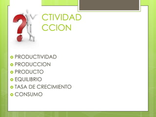 El documento presenta información sobre la productividad y la producción. Menciona los integrantes de un grupo y define conceptos clave como productividad, producción, producto, equilibrio, tasa de crecimiento, consumo y crecimiento económico. Explica que la productividad mide la relación entre la cantidad de productos obtenidos y los recursos utilizados, y que la producción se refiere a la generación de bienes y servicios.