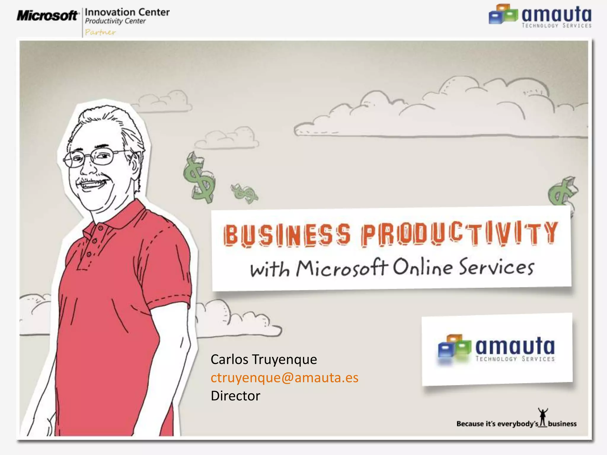 El documento presenta una introducción a las capacidades de Microsoft Business Productivity Online Suite (BPOS), incluyendo demos de acceso unificado a correo electrónico y calendario, bandeja de entrada unificada, eficiencia a través de la colaboración y conferencias virtuales. El BPOS ofrece software empresarial alojado en la nube a un costo mensual por usuario, integrando aplicaciones como Exchange, SharePoint, Communications Server y Live Meeting.