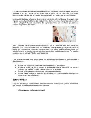 El documento describe los conceptos de productividad y competitividad y su relación. La productividad se refiere a la eficiencia en el uso de recursos para producir bienes y servicios, mientras que la competitividad se refiere a la capacidad de una nación, empresa u organización para competir en los mercados internacionales. El documento explica que la innovación y la productividad son factores clave para la competitividad y progreso económico de un país.