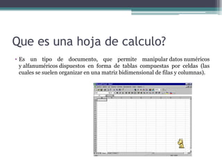 Una hoja de cálculo es un documento que permite manipular datos numéricos y alfanuméricos en celdas organizadas en filas y columnas. Las celdas se encuentran en la intersección de una fila y una columna y pueden contener datos u operaciones. Algunas funciones básicas en hojas de cálculo incluyen suma, resta y producto.