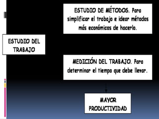 Este documento presenta información sobre el estudio del trabajo y la ingeniería de métodos. Explica que el estudio del trabajo busca mejorar las tareas, determinar tiempos y aumentar la productividad. Describe las técnicas de estudio de métodos y medición del trabajo. Además, introduce a Frederick Taylor y Frank Gilbreth como pioneros en el desarrollo de estos métodos científicos para analizar y mejorar el trabajo.