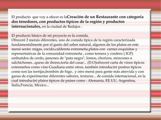 El documento define las variables de marketing, en particular el producto. Explica que el producto principal del restaurante propuesto es la comida, incluyendo dos menús, uno con platos típicos de Extremadura como migas, cocido y queso de Ibores, y otro con platos internacionales populares como paella, sushi y pad thai. Además, detalla los requisitos para ser considerado un restaurante de dos tenedores según la normativa regional, como contar con guardarropía, teléfonos y baños independientes para hombres y mujeres.