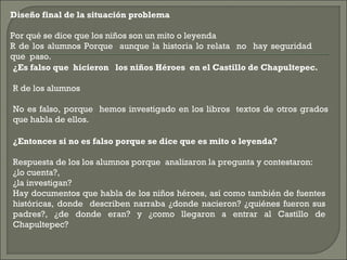 El documento presenta una situación problema sobre los Niños Héroes de Chapultepec. Los estudiantes investigaron en libros de texto y otras fuentes para concluir que aunque la historia de los Niños Héroes se cuenta como un mito o leyenda, hay evidencia histórica que confirma los hechos. Los estudiantes también aprendieron sobre las acciones valientes de los Niños Héroes para defender el castillo y su país.