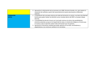 El documento propone medidas para mejorar la coordinación entre ciclos y la evaluación de los alumnos, mejorar la comunicación con las familias y utilizar las nuevas tecnologías, aprovechar las reuniones de los equipos docentes para mejorar la eficacia, reducir las reuniones para aumentar la eficacia, formar al profesorado en resolución de conflictos, aprovechar la información de otros servicios para mejorar la resolución de conflictos, aprobar la jornada continua para tener más flexibilidad horaria para la formación docente y encontrar p