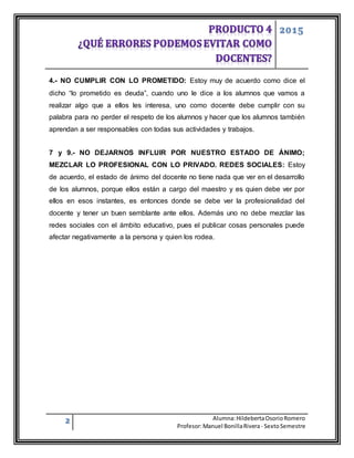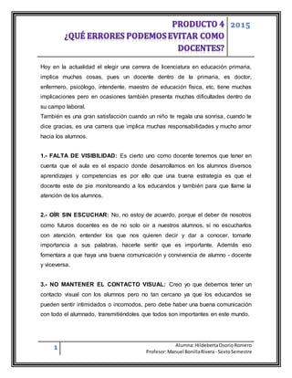 Este documento discute las implicaciones de elegir una carrera como maestro de educación primaria. Aunque ser maestro implica muchas responsabilidades y retos, también proporciona gran satisfacción, como cuando los niños sonríen o dan las gracias. El documento luego analiza algunos desafíos comunes que enfrentan los maestros como falta de visibilidad en el aula, escuchar sin realmente escuchar a los estudiantes, falta de contacto visual adecuado, y no cumplir con las promesas hechas a los estudiantes. Finalmente