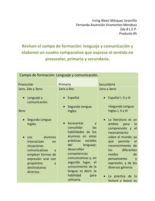 El documento pide revisar el campo de formación de lenguaje y comunicación y elaborar un cuadro comparativo que expresa el sentido en preescolar, primaria y secundaria. El resumen proporciona un cuadro con tres oraciones que describen brevemente los aspectos clave de lenguaje y comunicación en cada nivel educativo.