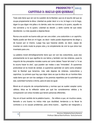 Este documento discute la libertad y la ética. Argumenta que la libertad es la capacidad de elegir entre hacer o no hacer algo independientemente de las órdenes de otros. También sostiene que las acciones no son buenas solo por seguir órdenes, costumbres o caprichos, y que para ser libre uno debe ser capaz de elegir su propia vida en lugar de vivir la vida que otros han planeado. Finalmente, define la ética como la reflexión sobre qué comportamientos y normas consideramos válidos y por qué, en comparación con otras morales.