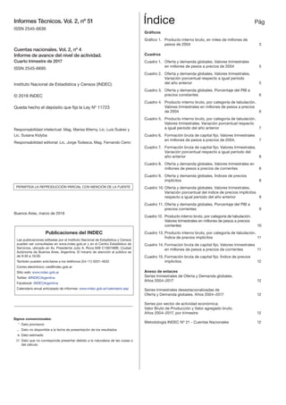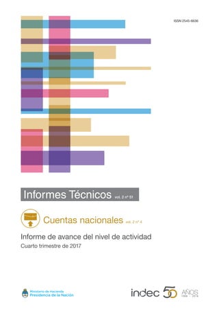 Este documento presenta estimaciones provisionales del Producto Interno Bruto (PIB) para el cuarto trimestre de 2017 en Argentina. Reporta un aumento del PIB del 3.9% interanual y del 1% desestacionalizado respecto al trimestre anterior. También analiza la oferta y demanda globales, destacando incrementos en la formación bruta de capital fijo, consumo privado y público, e importaciones. Además, revisa estimaciones preliminares del valor agregado por sector económico.