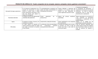 Este documento presenta un cuadro comparativo de los conceptos de asesorar, acompañar, tutorar y gestionar conocimiento. Define cada término y describe sus tareas, propósitos, implicaciones y estrategias de acción. Explica que asesorar implica ofrecer consejo y alternativas para mejorar la práctica, acompañar es un proceso compartido de apoyo mutuo, tutorar ayuda a fortalecer la formación a través de estrategias, y gestionar conocimiento mejora procesos mediante la captura y aplic