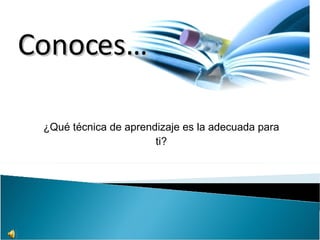El documento presenta diferentes técnicas de aprendizaje como mapas mentales, mapas conceptuales, hexagramas y mapas cognitivos. Explica brevemente quién creó cada técnica, para qué sirve, cómo se elabora y algunos ejemplos. Al final, invita al lector a elegir la técnica más adecuada para su aprendizaje personal.