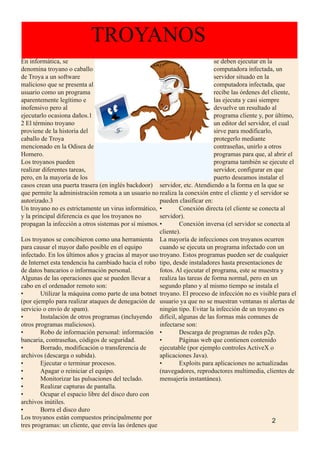 1. Un virus informático es un malware que infecta computadoras sin el permiso del usuario, reemplazando archivos ejecutables con versiones infectadas y propagándose a otros sistemas. 2. Los virus pueden destruir datos de manera intencional o ser simplemente molestos. 3. Un gusano es un malware que se duplica a sí mismo a través de una red de computadoras, consumiendo recursos y causando problemas en la red.