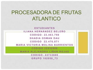 Este documento presenta los resultados de los estudios de mercado, técnico y financiero realizados para el proyecto de adquirir una procesadora de frutas y establecer una empresa para procesar y comercializar pulpa de frutas 100% natural en el departamento de Atlántico, Colombia. Los estudios muestran que existe demanda para este tipo de producto natural y que la producción requerirá personal, maquinaria y una planta procesadora.