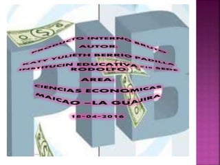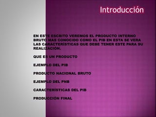 El documento define el Producto Interno Bruto (PIB) como una medida del valor monetario de los bienes y servicios finales producidos en un país durante un período, generalmente un año. Explica que el PIB mide la producción final dentro de las fronteras de un país, mientras que el Producto Nacional Bruto (PNB) mide el ingreso de los residentes de un país, ya sea de la producción interna o externa. También discute algunos métodos para calcular el PIB y limitaciones en su uso.