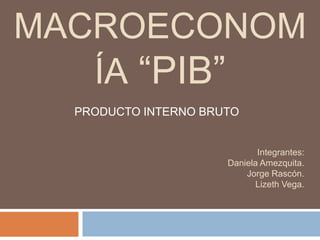 Este documento define y explica el Producto Interno Bruto (PIB). El PIB mide el valor monetario total de los bienes y servicios finales producidos en un país en un período determinado. Se calcula sumando el valor agregado de cada sector de la economía o mediante la suma de los ingresos generados. El documento también describe cómo se diferencia el PIB nominal del PIB real y explica conceptos relacionados como el Producto Nacional Bruto, las cuentas nacionales y el comportamiento del PIB en México en los últimos 10 años.