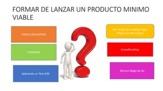El producto mínimo viable debe tener un diseño sencillo y práctico, así como la funcionalidad y fiabilidad necesarias para satisfacer las necesidades de los clientes y generar valor. Algunas técnicas para lanzar un producto mínimo viable incluyen videos explicativos, páginas de aterrizaje, tests A/B y crowdfunding para validar el interés del mercado con esfuerzo y recursos mínimos.