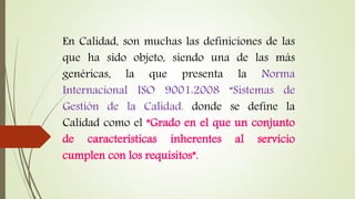 Este documento define la calidad como el grado en que un servicio o producto cumple con los requisitos. Explica que una no conformidad ocurre cuando un requisito no se cumple y que estas pueden ser detectadas a través de inspecciones, quejas de clientes u auditorías. Las no conformidades se clasifican y se debe realizar un análisis de causa raíz para eliminar las causas subyacentes a través de acciones correctivas, de corrección o preventivas.