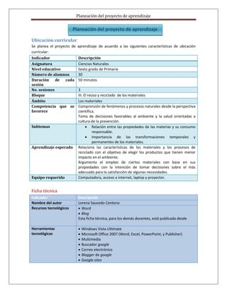 Este documento presenta la planeación de un proyecto de aprendizaje sobre el reúso y reciclado de materiales para alumnos de sexto grado de primaria. El proyecto consta de 3 sesiones de 50 minutos cada una e incluye actividades como analizar videos y textos, realizar encuestas, investigar sobre separación de residuos, y crear folletos informativos. El objetivo es que los estudiantes comprendan la importancia de clasificar y reciclar los desechos para reducir la contaminación ambiental.