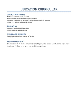 El documento proporciona detalles sobre una lección de Formación Cívica y Ética para alumnos de 14 a 17 años. La lección se llevará a cabo en una sesión de 50 minutos y abordará por qué es importante pensar en el futuro. Los estudiantes completarán varias actividades individuales y colaborativas utilizando herramientas como video de YouTube, correo electrónico, Facebook y Microsoft Office para explorar cómo construir y modificar su futuro a través de la toma de decisiones. El producto final será un portafolio publicado en