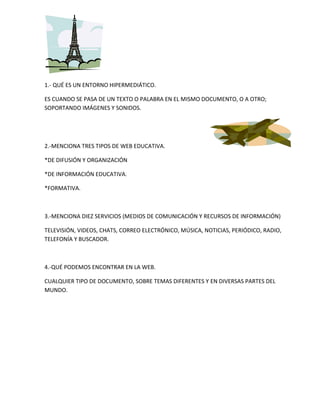 El documento resume los puntos principales de la primera sesión de un curso TIC sobre entornos hipermediáticos y la web. Explica qué es un entorno hipermediático, menciona tres tipos de web educativa y diez servicios de comunicación e información. También describe qué se puede encontrar en la web, define qué es Internet y menciona medios que se podrían usar en educación. Además, lista las características de la web 2.0 y ejemplos de páginas web, y presenta los objetivos de preparar a los estudiantes para