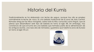 El kumis es una bebida tradicional de Asia Central elaborada originalmente con leche de yegua aunque hoy usa leche de vaca. Se desarrolló en el siglo XIII por tribus mongolas y era consumida por los antiguos escitas en el siglo VII a.C. Se produce mediante la fermentación láctica de la leche con bacterias lácticas que convierten la lactosa en ácido láctico. El proceso incluye pasteurización, enfriamiento, inoculación del cultivo láctico, incubación y envasado refrigerado.
