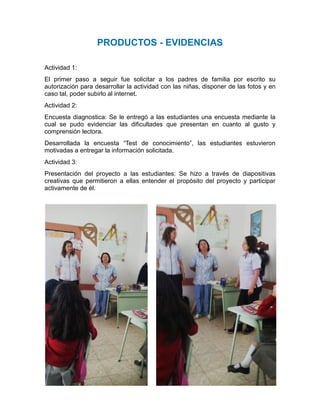 El documento describe 6 actividades realizadas con niñas para mejorar su gusto y comprensión lectora. La primera actividad involucró obtener permiso de los padres para fotografiar a las niñas. La segunda fue una encuesta diagnóstica que reveló dificultades lectoras. La tercera presentó el proyecto a las niñas usando diapositivas. La cuarta actividad involucró leer, transcribir y ambientar un poema. La quinta tuvo a las niñas crear un cuento ambiental usando material reciclable y Power