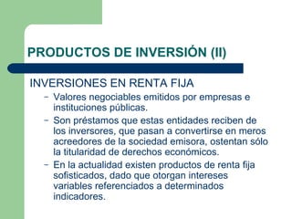 El documento describe diferentes tipos de productos de inversión en renta fija, incluyendo deuda pública como letras del tesoro y bonos del estado, deuda privada como pagarés de empresa y bonos corporativos, y productos más complejos como cédulas hipotecarias, titulizaciones y participaciones preferentes. También cubre bonos estructurados, los cuales pueden implicar la pérdida del capital invertido y son de difícil comprensión para los inversores minoristas.