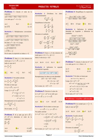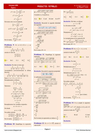 Este documento presenta 14 problemas de álgebra resueltos. Los problemas involucran operaciones con raíces, identidades de Legendre, diferencia y suma de cuadrados, y simplificación de expresiones radicales. Las respuestas a los problemas van desde números hasta expresiones algebraicas simplificadas.