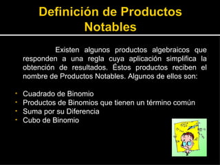 El documento explica diferentes productos notables de álgebra, incluyendo la fórmula general para el cuadrado de un binomio, la suma por su diferencia, y el cubo de un binomio. Proporciona ejemplos para ilustrar cómo aplicar estas fórmulas y resuelve productos algebraicos usando las reglas de los productos notables.