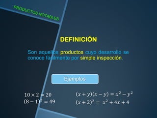 Este documento resume los principales métodos para desarrollar productos notables de álgebra. Explica cómo desarrollar el cuadrado de un binomio, el producto de la suma y la diferencia de dos binomios, y el producto de tres binomios que comparten un término común. Proporciona ejemplos para ilustrar cada método.