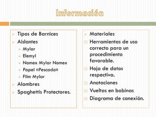 El documento describe diversos productos y materiales utilizados en el rebobinado de máquinas eléctricas, incluyendo diferentes tipos de barnices y aislantes como mylar y nomex. Se subrayan las funciones y ventajas de los barnices, tales como la mejora de la rigidez mecánica y propiedades dieléctricas, así como sus aplicaciones específicas. Además, se menciona la importancia de herramientas y técnicas adecuadas para un mantenimiento efectivo durante el proceso de reparación.