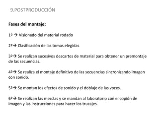 El documento describe las fases de la postproducción cinematográfica, incluyendo el montaje, edición y sonorización. Explica los pasos del montaje, el uso del software de edición, y describe los estudios y equipos necesarios para la edición de video, sonorización y revelado de copias.