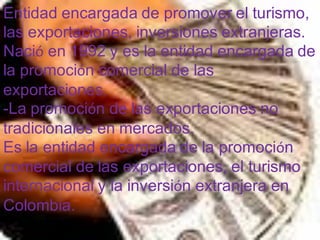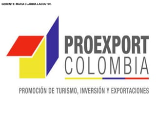 Proexport es la entidad encargada de promover el turismo, las exportaciones y las inversiones extranjeras en Colombia. Fue creada en 1992 con el propósito de prestar servicios no financieros para apoyar las exportaciones y promover la cultura exportadora. Actualmente, Proexport se enfoca en promover el comercio exterior, las exportaciones y atraer turismo e inversión extranjera al país. Ofrece varios recursos y servicios para apoyar a los exportadores colombianos.
