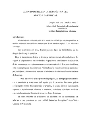 El documento describe cómo la actividad física puede ser beneficiosa en el tratamiento de la adicción a las drogas. Explica que la actividad física regular puede mejorar la salud física y mental de los adictos al reducir el estrés y la ansiedad y aumentar la autoestima. El autor propone incorporar un programa de ejercicios aeróbicos y de resistencia en una comunidad terapéutica para estudiar sus efectos en la recuperación de los participantes.
