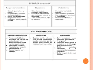 Este documento define qué es un cliente y los diferentes tipos de clientes. Un cliente es alguien que accede a un producto o servicio a través de una transacción financiera. Hay clientes activos, inactivos, complacidos, satisfechos e insatisfechos. También describe lo que busca un cliente al comprar y define los servicios y cómo se clasifican entre públicos y privados.