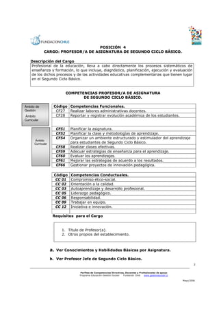 Este documento presenta el perfil de competencias de un profesor de asignatura de segundo ciclo básico. Describe las competencias funcionales, conductuales y los conocimientos básicos necesarios para el cargo. Entre las competencias funcionales se encuentran planificar la asignatura, planificar clases efectivas, evaluar aprendizajes y mejorar estrategias. Las competencias conductuales incluyen compromiso ético, orientación a la calidad y trabajo en equipo.